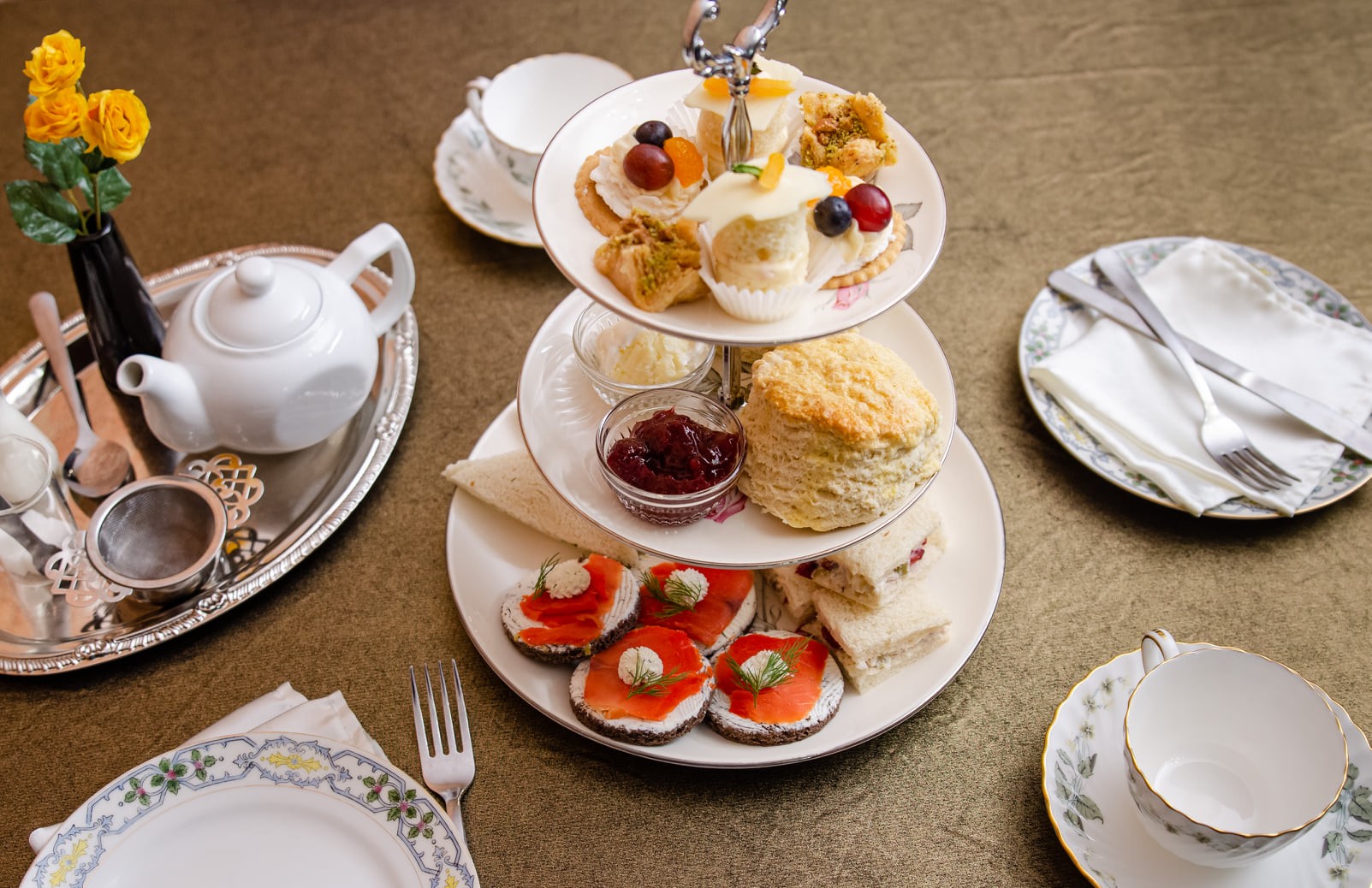 Afternoon Tea Package ($45/person): A formal service including three savories, a scone with clotted cream/jam, three desserts, and three self-serve tea varieties.